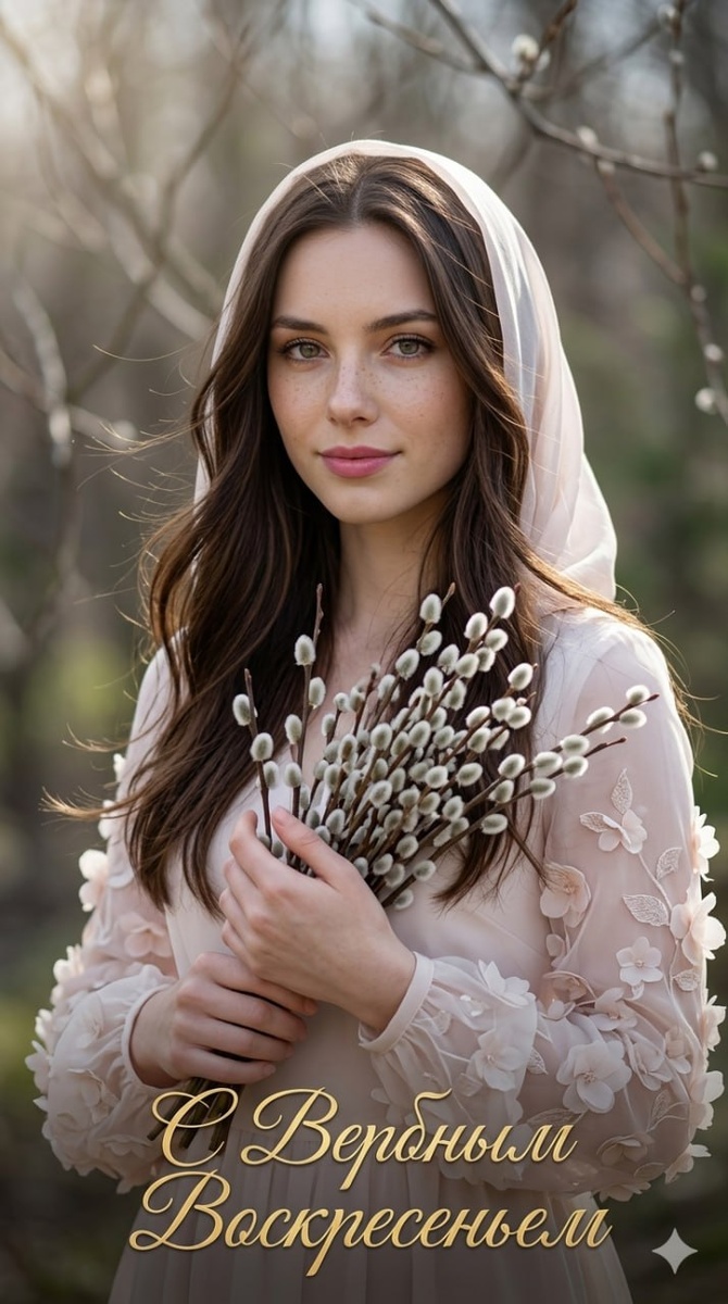 Напоминаю что через 9 дня - Вербное Воскресенье :) Сохрани черты лица с загруженных фотографий без изменений. Нежный и проникновенный портрет девушки с длинными волосами, слегка развевающимися по плечам. Она задумчиво держит в руках букет пушистых веточек вербы с мягкими белыми серёжками. Светлое платье с рукавами украшено воздушными тканевыми цветами. На голове — полупрозрачный платок. Поза — полупрофиль, взгляд направлен в камеру, на губах нежная улыбка. Безупречный макияж, нежно-розовые губы. На заднем плане — размытые тонкие ветки деревьев и приглушённая зелень. Свет мягко падает сверху и немного сбоку, подчёркивая текстуру ткани и шелковистость волос, создавая плавные едва заметные тени на лице и руках. Атмосфера спокойствия и тёплого весеннего утра. Фотореалистичное изображение, высокая текстурная детализация, качество 8K, соотношение сторон 9:16. Внизу кадра красивая надпись золотым шрифтом: «С Вербным Воскресеньем». Если тормозит Telegram, делаю в русском веб-сервисе gptun