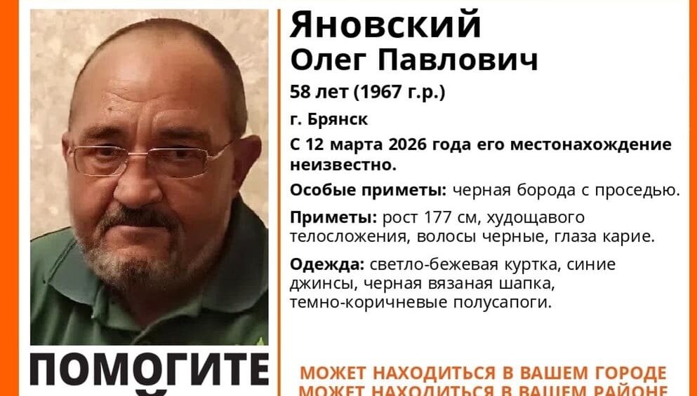 В Брянске пропал без вести 58-летний местный житель Олег Яновский, об этом рассказали волонтёры поискового отряда «Лиза Алерт».