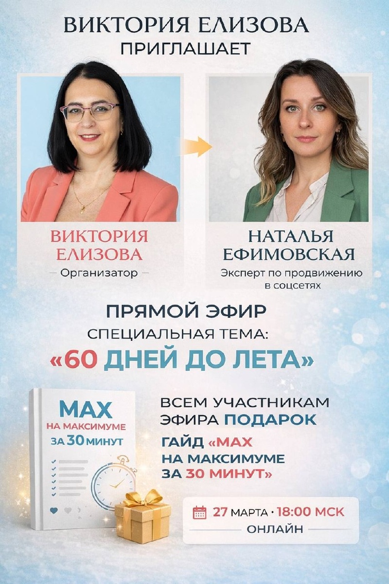 Как известно, лето самый «болезненный» сезон для детских центров, сегодня с руководителем детского центра Ваш Гений- Викторией Елизовой будем говорить о том, когда и как продавать летние продукты. Совместный эфир: Наталья Ефимовская / Виктория Елизова Время: 27 мар. 2026 18:00 PM Москва Подключиться к конференции Zoom https://us06web.zoom.us/j/8687192760?pwd=K15zpAcYyn9UbUa3VZ2RqK0hVzxFeR.1&omn=88661679802 Идентификатор конференции: 868 719 2760 Код доступа: 222 --