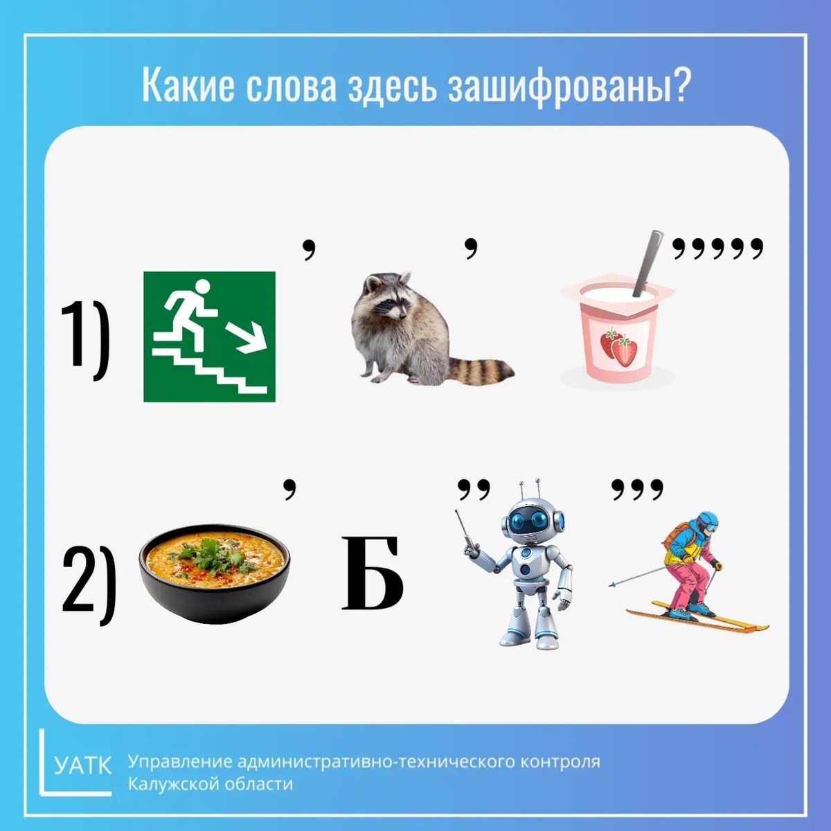 Сегодня предлагаем провести время с пользой и проверить свои навыки в решении ребусов. 🔍Задача непростая, требует внимательности и логики. 👍 Сумеете определить, какие слова зашифрованы в наших карточках? ➡️ Ждем ваши варианты в комментариях. #УАТК40 #УАТК #Калужскаяобласть #УАТКребусы