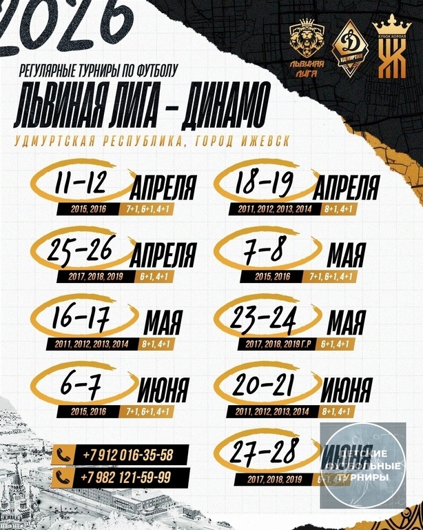 ! 🔥🏆 Львиная Лига | Всероссийские турниры по футболу (https://vk.com/club224114653) Мы открываем набор команд на серию наших легендарных Регулярных турниров по футболу «ЛЬВИНАЯ ЛИГА – ДИНАМО», которые стартуют уже в апреле! 🤩⚽ Турниры пройдут на легендарном стадионе «Динамо» в городе Ижевске — одном из лучших спортивных комплексов Поволжья💙 📆 Все даты, форматы и возрастные категории уже есть в нашей афише — найдётся место для команды любого уровня подготовки 💪🏼 Мы готовы максимально ярко ворваться в большой футбольный сезон 💥 Ты с нами? 😉⚽ 📲По вопросам участия и подачи заявки: +7 (912) 016-35-58 — Артем Бочкарев (https://vk.com/id164935600) +7 (982) 121-59-99 — Александр Кузнецов (https://vk.com/id182385598) -— #ФутбольныйТурнирАпрель2026 #ФутбольныйТурнирМай2026 #ФутбольныйТурнирИюнь2026 #ФутбольныйТурнирЦентральнаяРоссия2026 #ФутбольныйТурнирИжевск2026 #ФутбольныйТурнирИжевск2011гр #ФутбольныйТурнирИжевск2012гр #ФутбольныйТурнирИжевск2013гр #ФутбольныйТурнирИжевск2014г