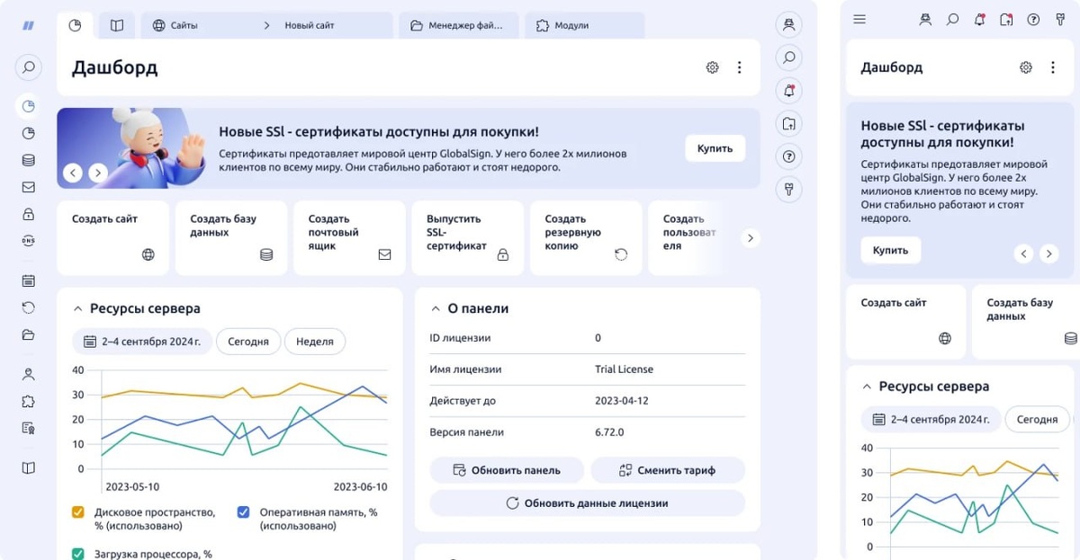 😊 Разработчики переосмыслили вкладки, меню, таблицы и формы, чтобы сделать интерфейс более удобным для пользователей. Обновлённая панель корректно работает на устройствах с любым разрешением экрана. Смартфон, ноутбук или большой монитор – ispmanager автоматически подстраивается под ваше устройство. Также расширили возможности для кастомизации. Это уже не просто «светлая или тёмная тема» – можно настроить цвета под себя или даже под бренд. Новый интерфейс уже доступен в бете (версия 6.139). После обновления в панели появится иконка, через которую можно переключиться и посмотреть, как это выглядит. 🔜 Напоминаем, что до конца года при создании нового Linux-сервера вы можете пользоваться ispmanager бесплатно. Переходите на наш сайт, выбирайте любой тариф, кроме VPS Старт, и наслаждайтесь всеми преимуществами обновлённой панели.