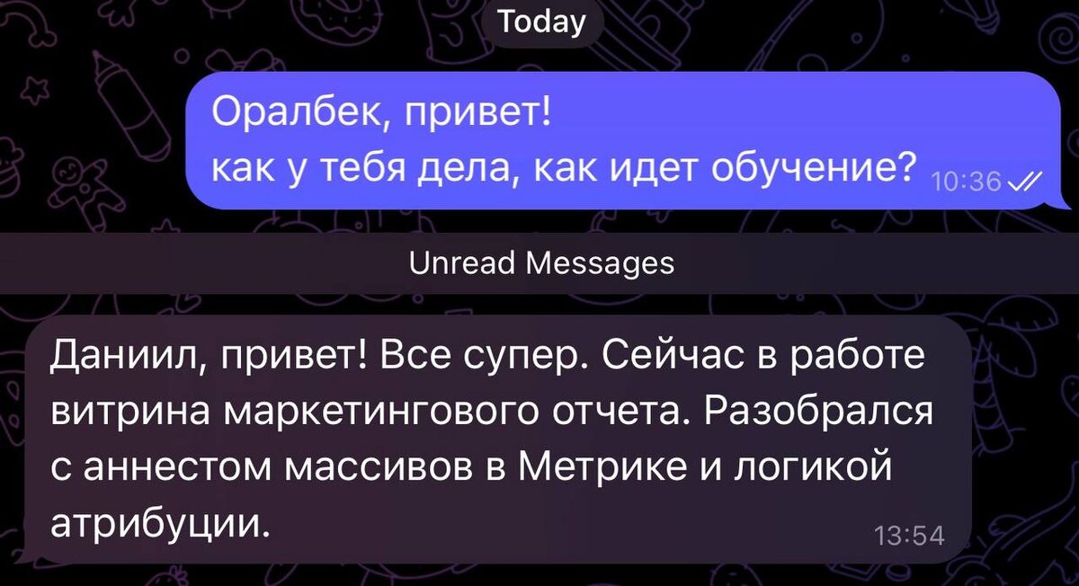 У текущей группы идет 2-й практический спринт, на скрине спрашиваю как в целом дела в процессе учебы идут. Знаете что приятно, ученики с курса по основам анализа приходят на курс по разработке витрин и показывают сильные результаты. Оралбек завершил основы и сразу пошел на следующую ступень. Ребята, ценю каждого из вас и ваше доверие ♥️ 👉 Про курс разработки витрин https://datastudy.ru/ (формат/программа/стоимость/запись в группу) P.S. а мы на обучении с помощью Яндекс Метрики проанализируем вашу активность на сайте и построим витрину с атрибуцией целевых действий 😉