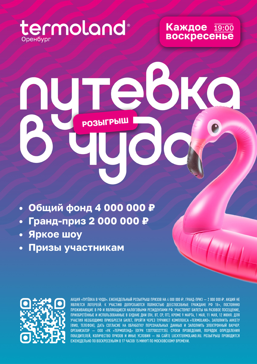 В этот же день, в 17:00 по московскому времени, будет организована видеотрансляция розыгрыша, которую смогут увидеть гости других комплексов Termoland. Прямое включение пройдет в локациях сети: «Физтех» в Москве, «Путилково»в Московской области, «Пулковский» в Санкт-Петербурге, а также в комплексах Ярославля и Новокузнецка. Особое внимание уделено праздничной программе в Оренбурге. Перед официальной частью гостей ждет выступление танцовщицы, задающее атмосферу праздника и отдыха. Далее программа продолжится интерактивной активностью у бассейна: участники смогут принять участие в игре, в рамках которой будут разыграны подарки от Termoland. После развлекательного блока состоится официальная часть, в рамках которой будут подведены итоги и объявлены победители акции. Дополнительный интерес к мероприятию усиливает обновление условий акции. С марта призовой фонд «Путёвки в чудо» увеличен до 4 000 000 рублей еженедельно, а главный приз составляет 2 000 000 рублей. Расширение призового фонда с