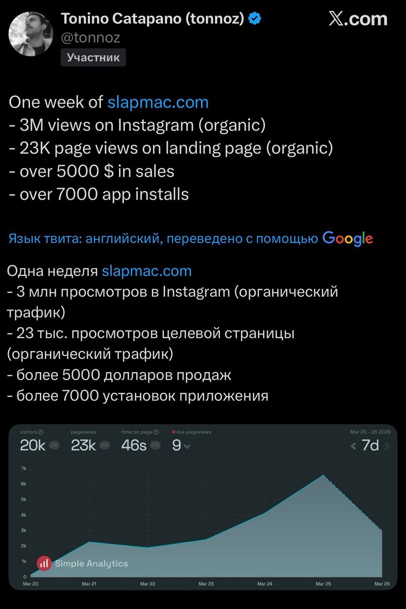 за неделю на вирусном приложении для MacBook Разработчик заработал $5 тыс. за неделю на приложении Slapmac для MacBook. Утилита использует акселерометр ноутбука для распознавания ударов по корпусу и воспроизводит стоны. Slapmac позволяет: • менять звук отклика, • просматривать статистику ударов. Стоимость приложения — $7. Бесплатно доступна только одна активация. https://dzen.ru/id/5c0e38ff46ef5c00aaa80527