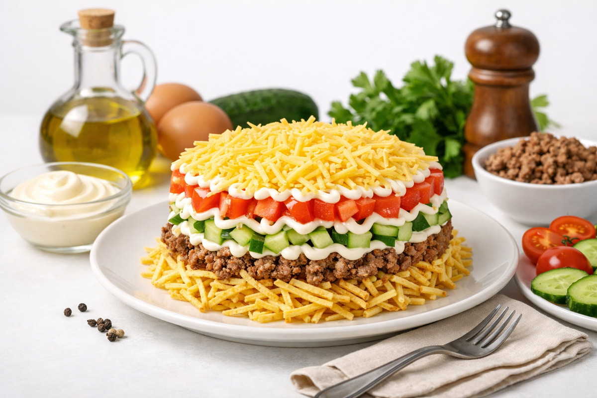 Снаружи он выглядит нарядно и даже немного празднично, а внутри - всё, что любят дома: хрустящий картофель пай, сочный обжаренный фарш, свежие огурцы, помидоры и нежный слой сыра. Такой салат удобно подать и к ужину, и на стол для гостей, когда хочется приготовить что-то эффектное без сложных продуктов.