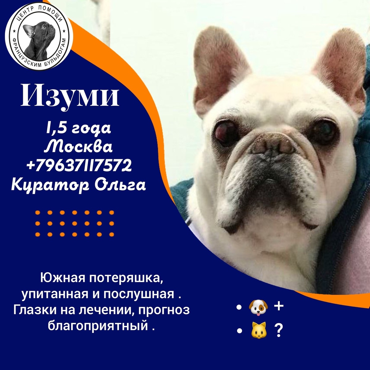 Девочка спокойная , дружелюбная , с хорошим аппетитом и базовым доверием к миру 🙌 С сообками любого темперамента находит общий язык и совместное времяпрепровождение : дрыхнуть вместе на диванчике , пока кожаные работают 😜 Мария , которая заботится сейчас об Изуми, ездит с ней к офтальмологу и спасают глазик , на днях ставят заплатку на роговицу , шансы на хорошее зрение в дальнейшем - высокие . Ветеринария сейчас на должном уровне , операция накатанная 🙌 Сейчас #Изуми@frenchbull_help живет на передержке в Новой Москве, Юг, можно приезжать знакомиться с серьезными намерениями Но до этого : 🧡смотрим отчет по булочке : https://vk.ru/topic-144285450_56997120 💙заполняем анкету http://vk.com/app5619682_-144285450 💛Не ждем у моря погоды! заполнили? Звоним и пишем куратору : +79637117572, вотсап, ТГ @olga_setina ВК [id3014363|Ольга Сетина]