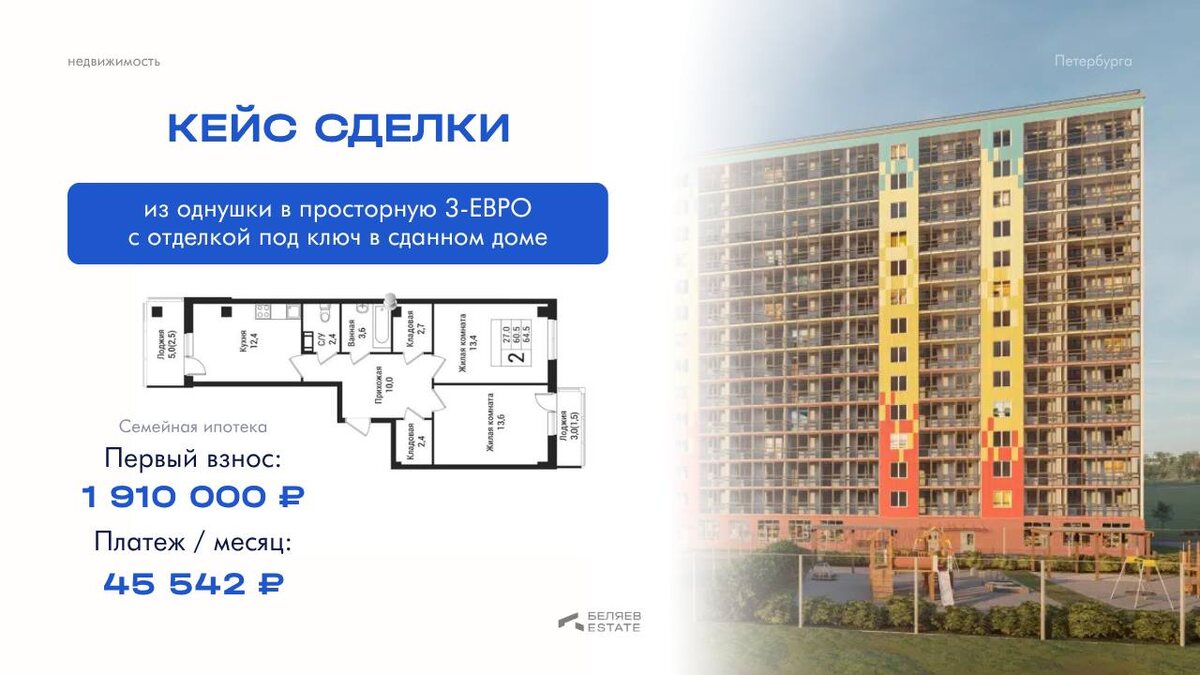 Семья жила во Всеволожске в однушке. Родился ребёнок — встал вопрос о переезде. Долго решались, но на фоне постоянных изменений по семейной ипотеке риск остаться вообще без квартиры кратно вырос. Встретились, обсудили варианты — нашли лучшее решение. ❓Что искали: Семья хотела остаться во Всеволожске или рядом — привычная локация, знакомая инфраструктура, детские сады и школы понятны. Смотрели Всеволожск, Янино, Кудрово. Но остались во Всеволожске. 🔍 Что нашли: Евро-трешку в проекте с действующей инфраструктурой на территории. Дом сдан — можно въезжать сразу. Квартира без отделки, но у застройщика есть опция заказать чистовую под ключ и включить её в договор в ипотеку. Стоимость с отделкой под ключ — 9 506 000 ₽ 👀 Какие были сложности: Банк сначала одобрил нужную сумму, но на этапе согласования объекта уменьшил одобренный кредит. Клиентам нужно было в моменте увеличить первый взнос на 500 000 ₽. Их, мягко говоря, у них не было. Владислав нашёл решение, как обойти условия банка