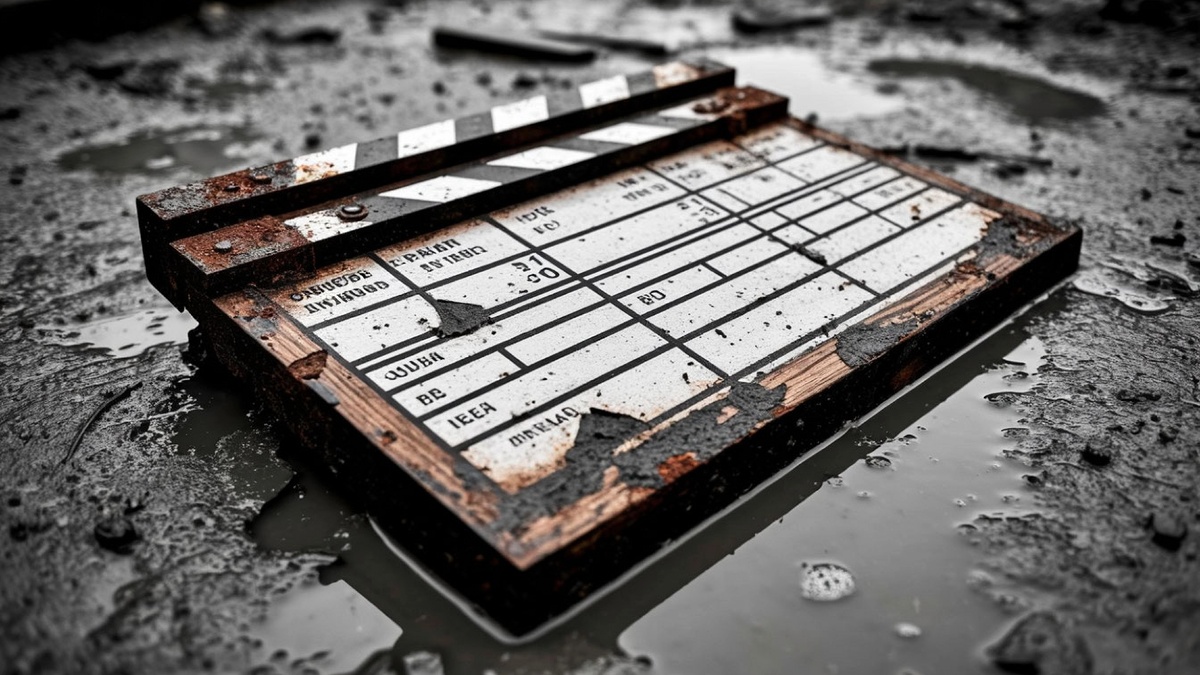 Прямо в колее, наполовину вдавленная в серую грязь и талый снег, лежала кинохлопушка. Ее дерево треснуло, пошло глубокими морщинами, в которые забилась жирная сажа. Белые полоски облупились, напоминая гнилые зубы в раскрытой пасти. Поверхность была покрыта слоем копоти и мутными каплями воды, а все надписи стерлись, превратившись в невнятные серые разводы.