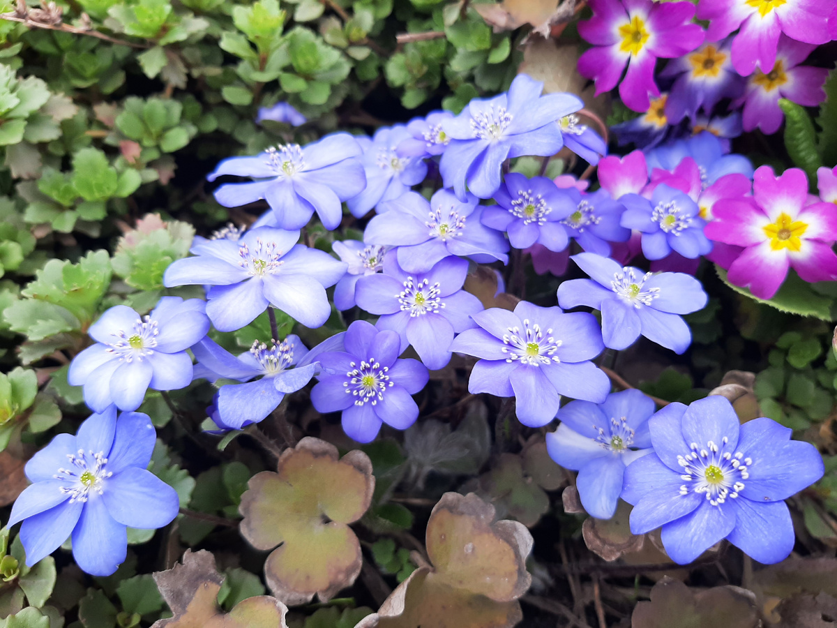Так кричит тройка растений, которые распустились на дорожке первоцветов чуть позже, чем основная масса. Но, печеночница уже тогда пыталась цвести, по крайней мере начинала, это моя старшая/старая печёночница, показывала я её при описании четвёртой части дорожки, но она тогда только начинала распускаться. А вот сейчас эта подруга на пике. Переживаю, что очиток может её придушить, но пока вроде бы мирно уживаются. В компаньонах у этой печёночницы ещё есть примулы, пересаживать и делить её элементарно боюсь, так как в нашем регионе это не очень распространённое растение и когда это лучше делать я пока не выяснила. Иридодиктум с именем, которого мы с Вами ещё не определились тоже припозднился. Сначала предположили, что это Gordon, но мой сиреневый и без белого на фолах. Буду до упора пытаться покупать Gordon, чтобы подтвердить или опровергнуть наши предположения. Распустился ещё прострел, который я купила на ярмарке прошлой весной, с ним было очевидно, что с первоцветами он не встретится,