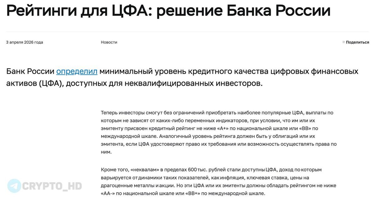 🇷🇺 ЦБ РФ установил правила для инвесторов в цифровые активы – релиз
