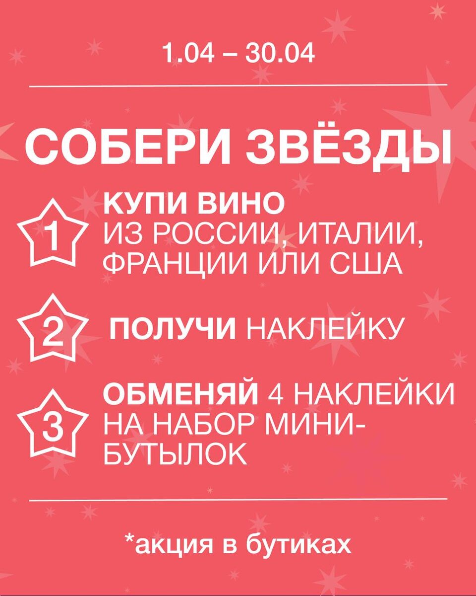 В апреле мы решили: пора отправлять в космос не только бутылки, но и вас. 🚀 С 1 по 30 апреля в наших бутиках — «Космобар» ❓Как участвовать Покупаете вино из России, Италии, Франции или США. (стоимостью от 1199₽) Можно всё из одной страны — главное, чтобы в чеке были бутылки из этого списка. ❓Как получить наклейки За каждую такую бутылку на кассе дают звёздную наклейку ⭐️ ❓Что в финале 4 наклейки = подарок: набор из трёх мини-бутылочек. Каких? Интрига. ❓Где искать На полках — воблеры со странами На мониторах — космические факты На кассе — карточки для наклеек. Приходите в бутики WineStyle, собирайте созвездие из любимых вин и забирайте космический приз. Без скафандра, зато с бокалом. 🪐🍷 *Акция только в офлайн-бутиках