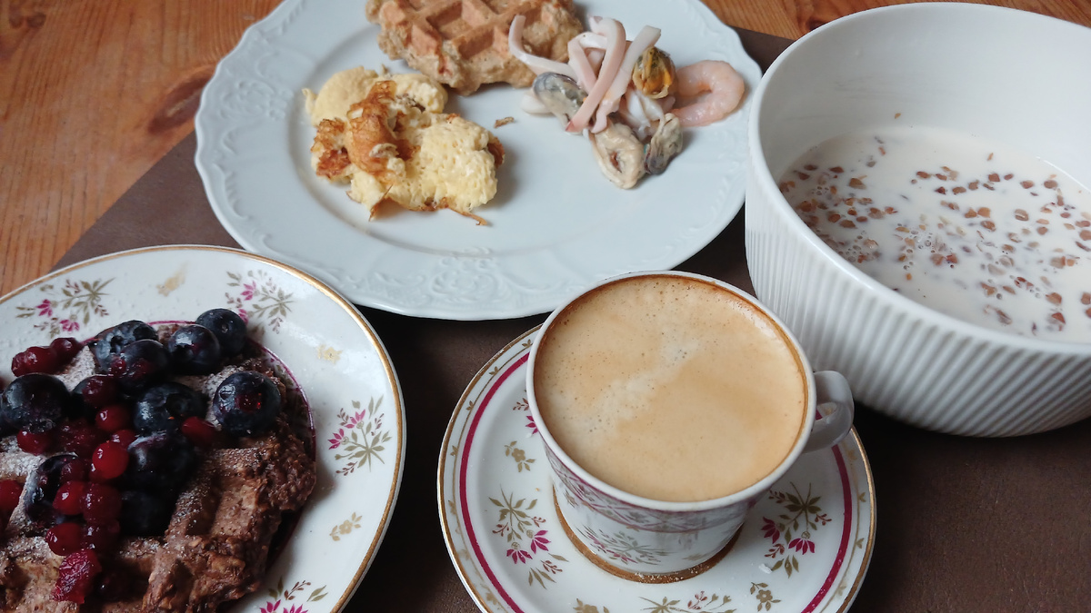 В апреле питаемся на 258 руб в день на человека. Сумма в месяц на питание - 7 750 руб на одного и 15 500 руб на двоих. Собирала сегодня завтрак из того, что было в холодильнике: гречка с молоком, овсяновафли, к ним - омлет и морепродукты. Чашка кофе с шоколадной овсяновафлей и ягодами Ездила сегодня в Ашан, т.к. надо было бонусы потратить, сделала большую закупку. На обед макароны по-флотски с фаршем из свинины. Макароны сварила безглютеновые Барилла, которые у меня давно уже лежат в запасах, и к которым я боялась вообще подступиться. Их мне привезли по ошибке вместо обычно Бариллы в заказе. Оказалось, вполне себе приличные макароны. Я даже пожалела, что так долго их игнорировала. Вполне вкусные! К макаронам болгарский перец и нарезка моркови. На десерт после обеда сыр Supreme, груша, халва и кофе А ужин уже совсем легким сделала: запеченный окорочок (мариновала в горчице), салат айсберг и ряженка Меню год назад Кстати, о вкусной еде☝. В Воронеже мы очень вкусно перекусили с сыном