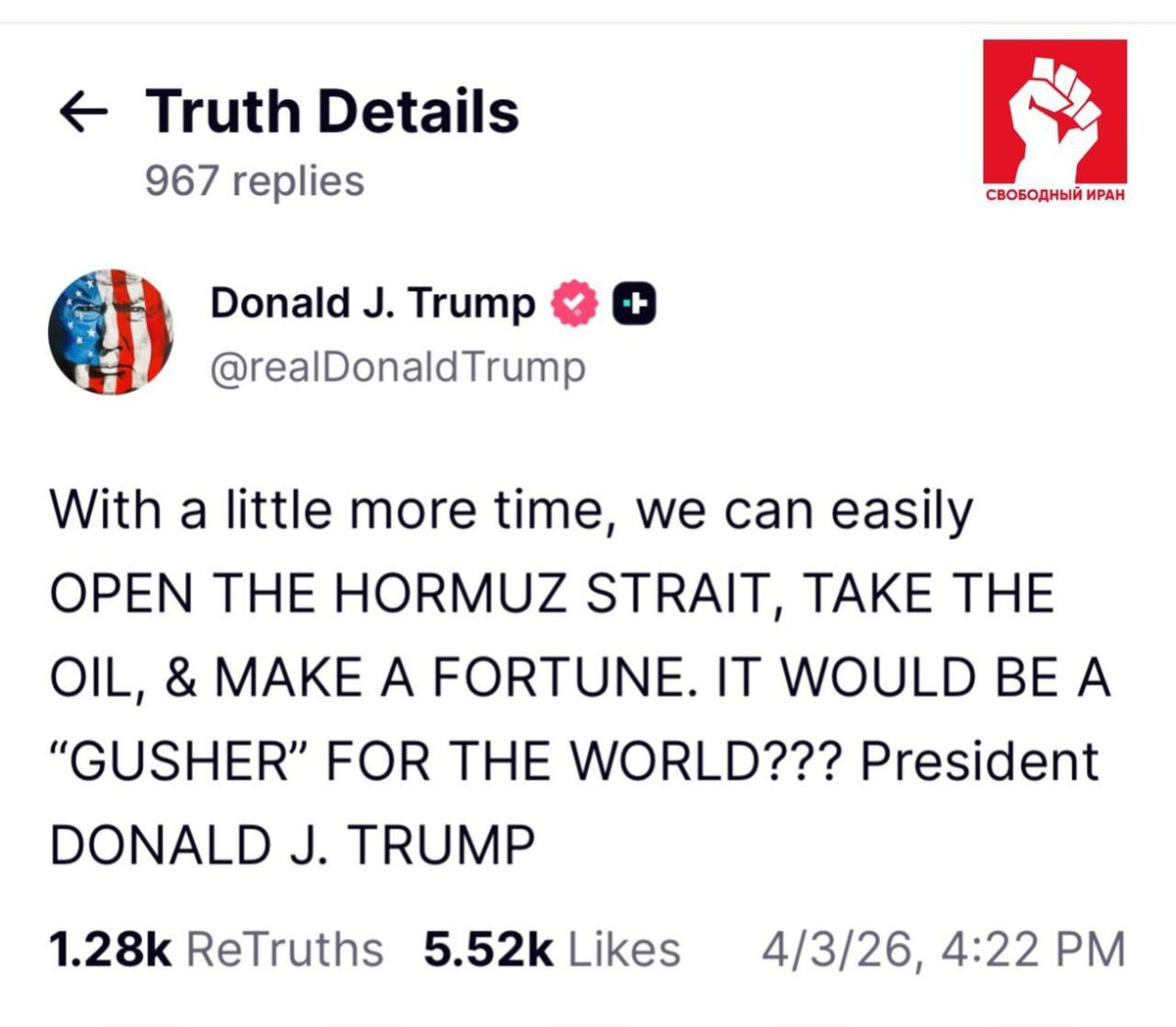 Трамп заявил, что США могут открыть Ормузский пролив, если получат немного больше времени. В Truth Social он связал это с контролем над нефтью и заработком, назвав это настоящим нефтяным фонтаном для мира.