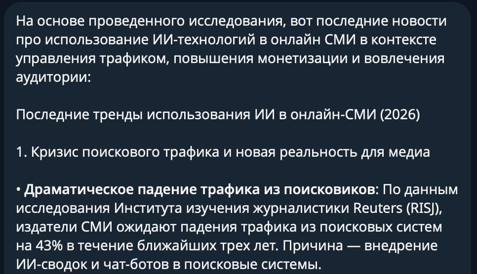 Это я. Настроил агента, чтобы он приносил мне новости из медиаиндустрии. Всё, что касается монетизации, новых технологий и работы с аудиторией. Прощайте, рассылки. Прощайте сайты! Я буду вспоминать вас с нежностью. P.S. А теперь подумайте, что будет, когда наступит масс-адопшн, и эти агенты будут приносить новости людям ежедневно в массовом порядке. Это уже и так происходит, потому что всё больше и больше людей спрашивают LLM-ки, в том числе о том, что происходит вокруг. Медиапотребление смещается в нейронки. Для медиа это означает, что нужно готовить технологическую базу для того, чтобы быть поставщиком контента для ИИ-агентов, а не для человека.