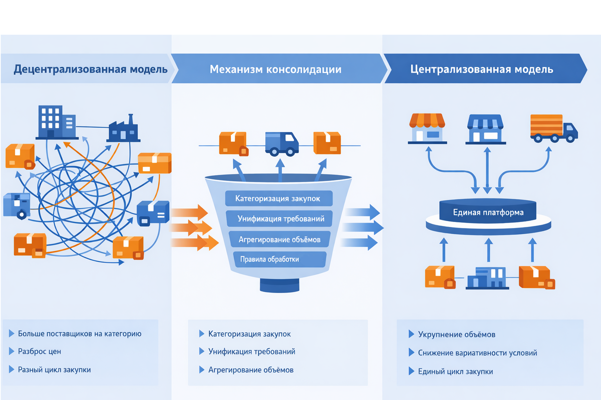 Пример: при годовой потребности в определенной категории оборудования на уровне 48 млн рублей, разделенной на 12 независимых закупок по 4 млн, цена единицы формируется с наценкой 12 % за счет отсутствия оптовой скидки и затрат на организацию тендеров. Консолидация сходных потребностей в одну закупку на 48 млн позволит снизить цену на те же 12 % и сократить операционные затраты на проведение закупок. Разница составит 5,8 млн рублей прямой экономии плюс несколько десятков часов рабочего времени снабженцев, которое они могут потратить с большей пользой.
