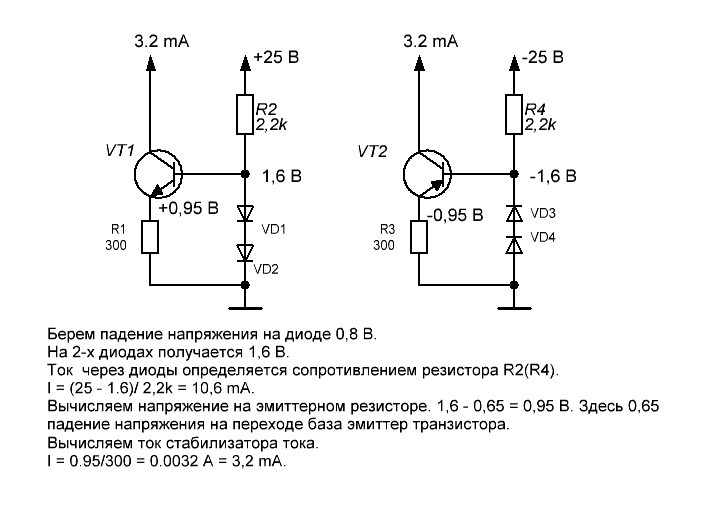 На транзисторе VT6 собран стабилизатор тока. Вычислим величину стабильного тока. Падение напряжения на 2-х диодах