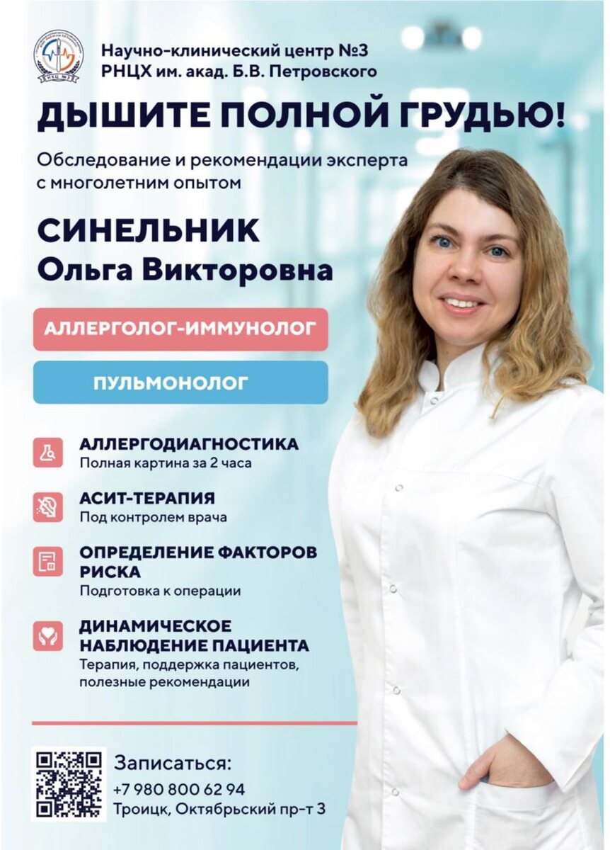 ! 🔹 Эксперт с многолетним опытом Обследование и рекомендации от аллерголога-иммунолога, пульмонолога Синельник Ольги Викторовны 🔹 Аллергодиагностика Всего 2 часа – и у вас на руках полная «картина» исследования организма на аллергии 🔹 АСИТ-терапия Под контролем врача 🔹 Определение факторов риска Подготовка к операциям больных с отягощенным аллергоанамнезом 🔹 Динамическое наблюдение пациента Полезные рекомендации от врача, поддержка и терапия (при необходимости) Записаться на прием: 📞+7 980 800-62-94 📞+7 980 800-05-42 ДМС: 📞+7 980 800-62-95 #ЗнакомствоСДоктором