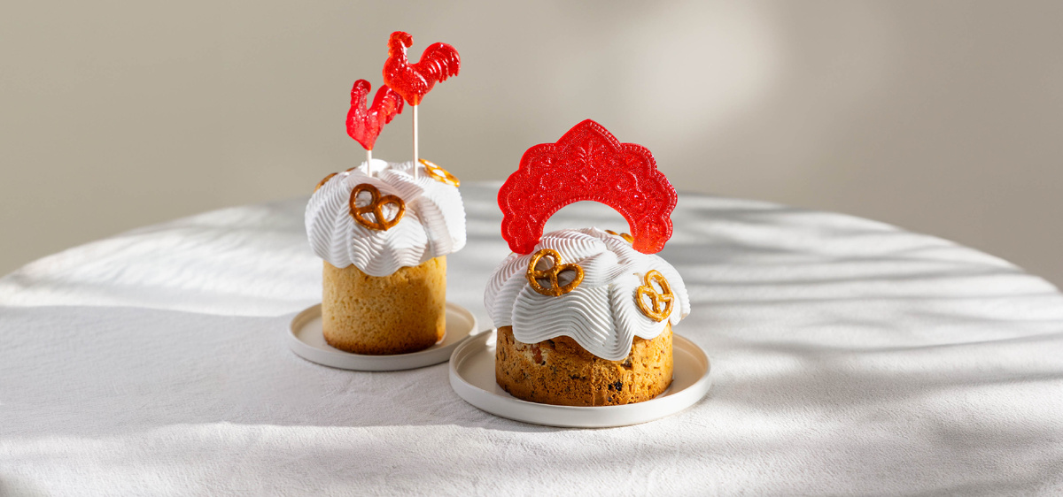 - Заглазируйте кулич любым понравившимся составом (мы использовали заварное белковое покрытие по этому рецепту и широкую зубчатую насадку для кондитерского мешка), украсьте петушками, сушками или крендельками.