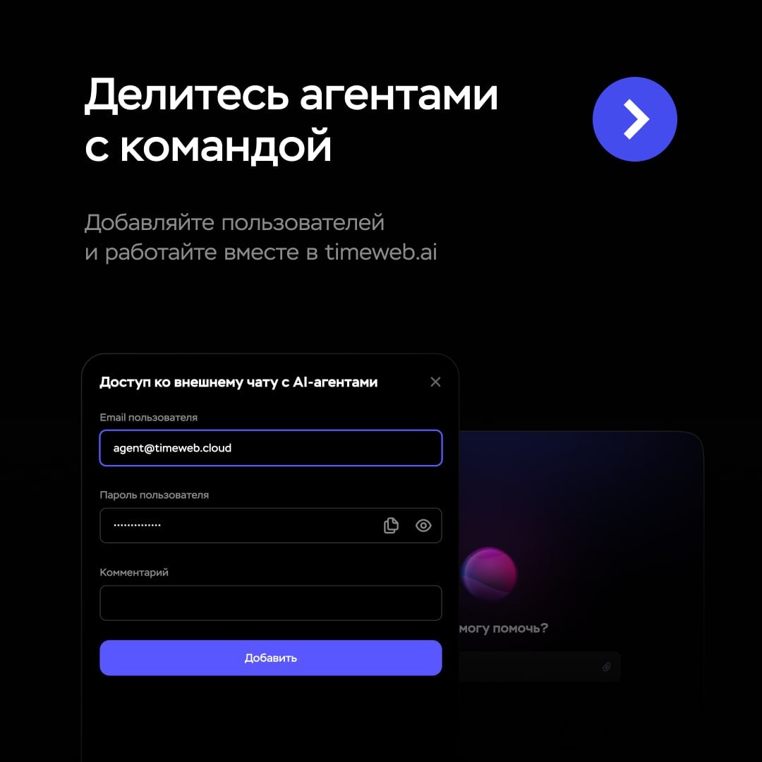? 🙄 А тем временем там появилась крутая фича — возможность шерить доступ к чату, а не просто работать в соло. Как это работает: Переходите на страницу AI-агентов и открываете настройки → добавляете почту доп пользователя → он получит письмо со ссылкой для входа и сохранит пароль ⚡️ Вуаля, можно работать с агентами в https://timeweb.ai Теперь чат — это полноценный командный инструмент, где вы: 1️⃣ Подключаете разработчика, маркетолога или саппорт — и все работают с одним источником 2️⃣ Шерите доступ коллегам из поддержки, чтобы они быстрее отвечали клиентам 3️⃣ Упрощаете онбординг нового сотрудника или подрядчика через агентов Настроить совместную работу с командой →
