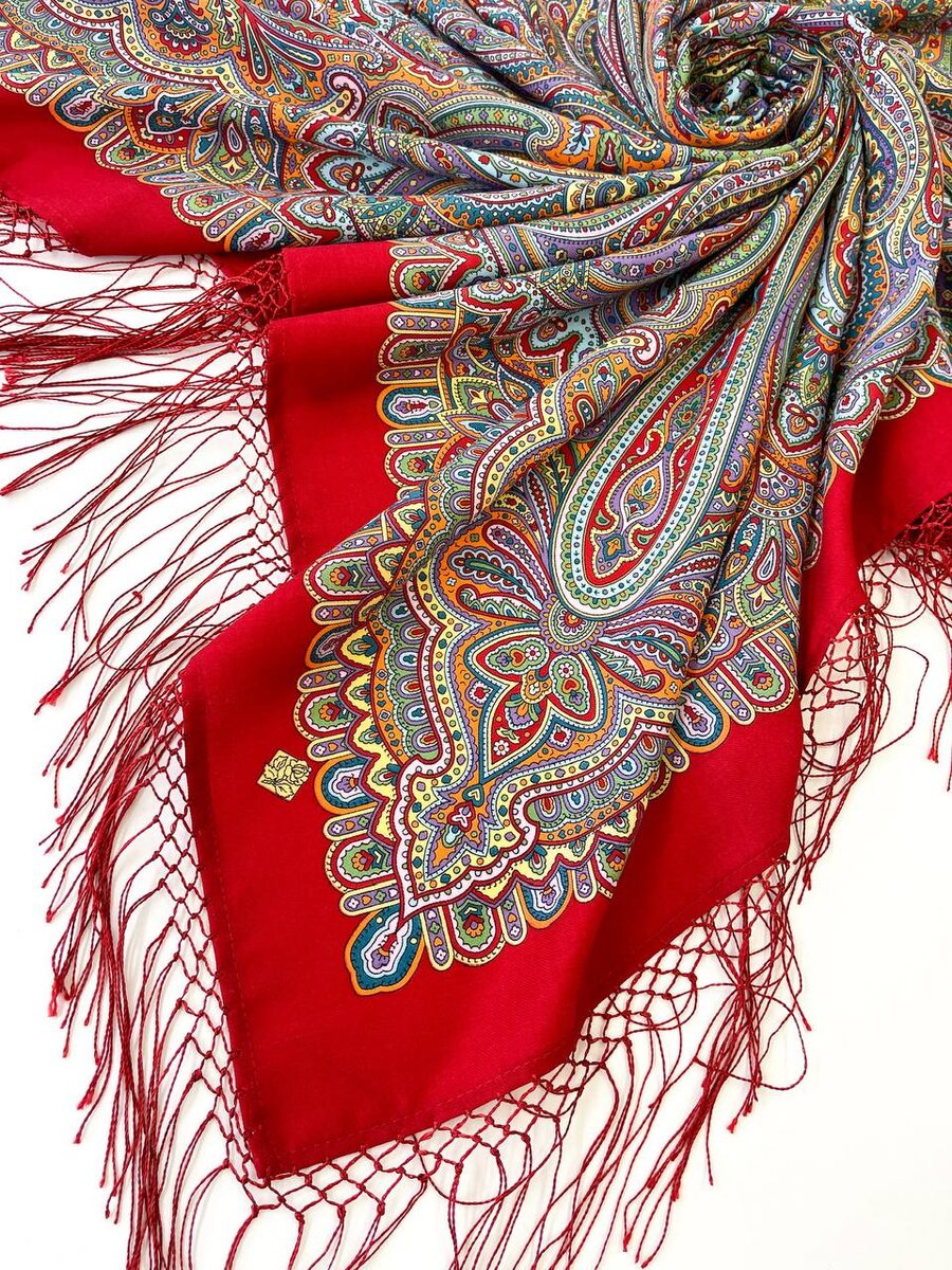 💥 Яркий, живой, наполненный энергией — этот платок сразу задаёт настроение. Насыщенный алый фон усиливает глубину рисунка, собирая воедино сложную орнаментальную композицию. В центре — симметричная розетка, от которой расходятся вытянутые большие «пейсли», переплетаясь в плотный декоративный ритм. 🎨Колорит выстроен на контрастах: горячий красный поддержан охристыми, бирюзовыми и приглушённо-лиловыми оттенками. Благодаря этому узор звучит многослойно, с тонкими переходами и акцентами. 🖌️ Каждый элемент прорисован с ювелирной точностью: изящные завитки, мелкий орнаментальный «зернистый» фон, тонкие контуры, придающие рисунку чёткость и глубину. ❤️Это история про цвет, который не боится быть заметным, и про орнамент, в котором хочется рассматривать каждую деталь. —————— Платок шерстяной с шелковой вязаной бахромой «Волжские берега» Арт. 1991-6 Размер: 135х135 см Художник: Белокур Наталья