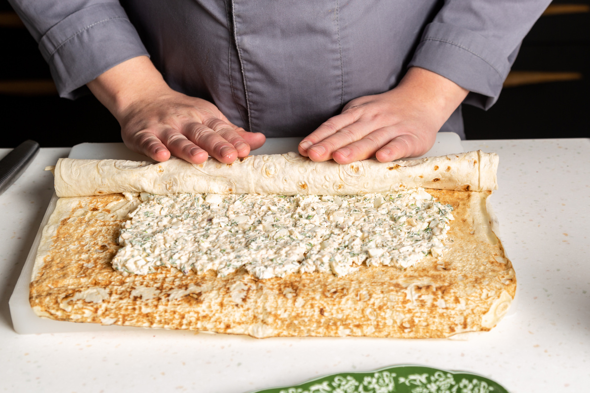 Сочетание сулугуни и варёных яиц — это просто находка! А если добавить к ним свежую зелень и закрутить всё в тонкий армянский лаваш, получится идеальное блюдо для завтрака, обеда на даче или пикника. 1️⃣ Отварите яйца и порубите средним кубиком. 2️⃣ Сыр сулугуни натрите на крупной тёрке. 3️⃣ Нарубите укроп и петрушку. 4️⃣ Смешайте натёртые яйца и сыр с зеленью, добавьте сметану и специи по вкусу. 5️⃣ Намажьте полученную начинку на лаваш. 6️⃣ Заверните лаваш в рулет и нарежьте на порционные кусочки.