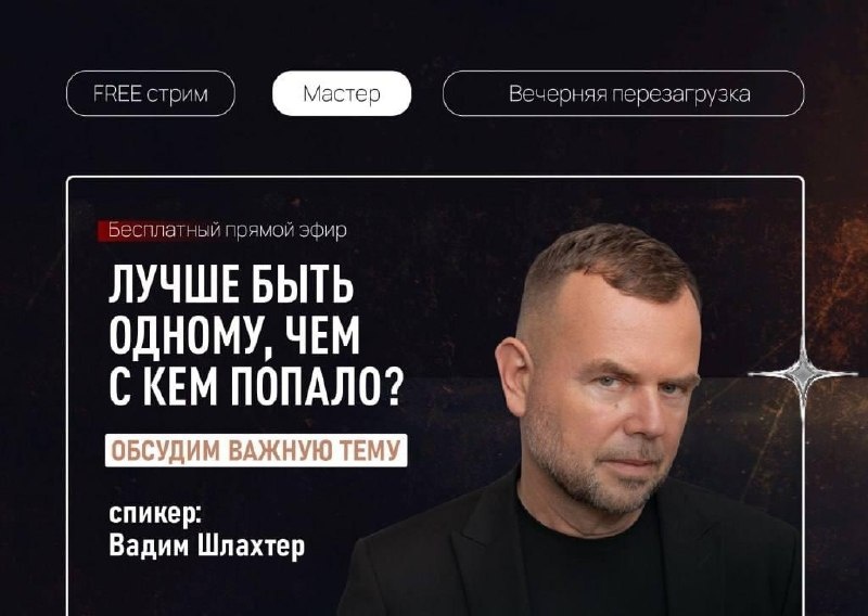 – Почему быть одному сильнее, чем рядом с кем попало – Как неправильный выбор людей разрушает дела и жизнь – Зачем мужчине период одиночества после разрыва – Почему случайные связи обесточивают и тянут вниз – Как одиночество включает рост, дисциплину и ясность Этот эфир будет полезен тем, кто запутался в отношениях, не может отпустить прошлое или боится остаться один. ➡️➡️➡️ Посмотреть его можно только в Коде Шлахтера.