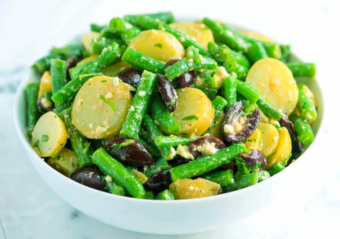 ■ В салатницу выложите картофель, белую часть лука и полейте заправкой так, чтоб она попала на все ингредиенты. Дайте остыть.