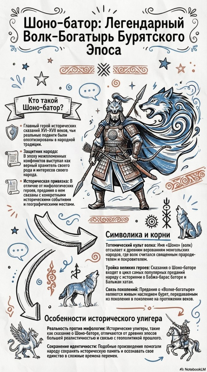 Шоно-батор является главным героем исторических сказаний XVI–XVII веков. В отличие от мифологических баторов, предания о нем связаны с реальными историческими событиями и конкретными географическими местами. В эпоху межплеменных конфликтов он выступал верным хранителем своего рода и интересов народа. Тотемическое имя героя означает «волк», что указывает на древний культ священного прародителя и покровителя у монгольских народов. Сказания о Шоно-баторе образуют цикл наиболее популярных народных преданий вместе с историями о Бабжа-барас баторе и Бальжан хатан. Особенности этого жанра заключаются в большей реалистичности и связи с геополитикой прошлого. Такие произведения помогали бурятскому народу сохранять историческую память и осознавать свое единство в сложные времена перемен.