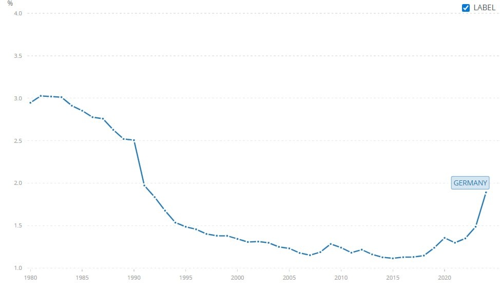 Он не просто может развалить альянс, это на самом деле может соответствовать долгосрочным интересам США. Впервые разговоры о том, что Трамп представляет угрозу для НАТО начались ещё в 2023 году, когда он не был кандидатом в президенты, и у меня про них был пост. Угрозы восприняли серьёзно, почти сразу был принят закон, который запрещал президенту США принимать решение о выходе из НАТО без одобрения Конгресса, причём его соавтором от республиканцев был Рубио. Вот что Рубио говорит сейчас: Когда нам нужна их помощь, мы не просим их наносить авиаудары; когда нам нужно, чтобы они позволили нам использовать свои военные базы, их ответ — нет. Тогда зачем мы в НАТО? Этот вопрос нужно задать. Не вдаваясь глубоко в историю и цели НАТО, можно сказать, что альянс сегодня — это часть затянувшегося «плана Маршалла». Благодаря защите США европейские страны после развала СССР могли почти не тратить деньги на собственные армии. Для примера на слайде график военного бюджета Германии в % от ВВП, уже