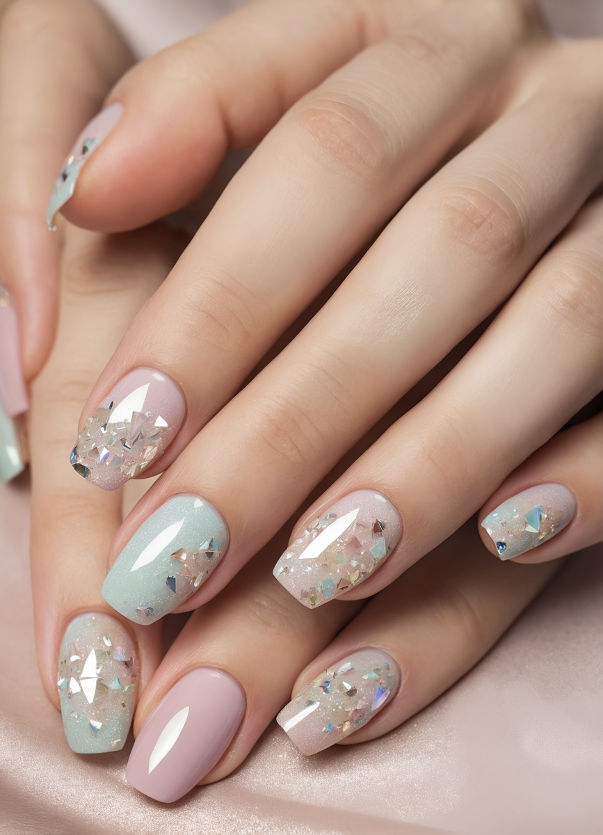 Эффект "битое стекло" в пастельных тонах отлично сочетается с градиентными переходами. Используйте два или три пастельных цвета для создания плавных переходов, а затем добавьте элементы "битого стекла" для текстуры. Это придаст маникюру глубину и необычность. Также можно комбинировать этот дизайн с геометрическими узорами, нанося их на свободный край ногтя, что создаст интересный контраст между мягкостью пастели и четкостью линий.