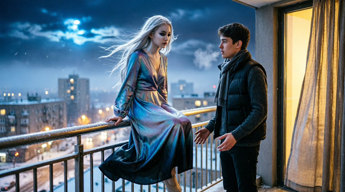 На перилах его балкона, свесив ноги в пропасть, сидела девушка. Она была одета в странное, мерцающее платье, которое переливалось то ли синим, то ли черным цветом, впитывая в себя свет. Её волосы были длинными, белыми, как иней на проводах, и развевались независимо от ветра. Она не смотрела на него, а созерцала огни внизу.
