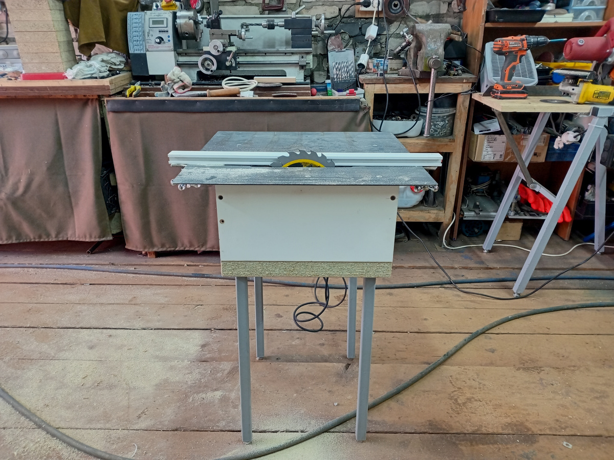 Теперь ставим стол. Его удобно сделать из стальных нарезаных листов, продаваемых на Озоне. Нарезаны они лазером, очень ровные. Я брал лист 50х50 см, толщиной 2 мм. Размеры - какие вам удобнее, а толщину меньше брать нельзя, будет хлипко... Прорезь под диск делается просто болгаркой. К ящику стол крепится саморезами через отверстия с глубокой зенковкой.