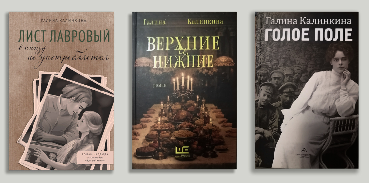 Романы Галины Калинкиной: «Лист лавровый в пищу не употребляется» - 2022 г., «Голое поле» - 2024 г., и «Верхние и нижние» - 2026 г. - это уже широкая панорама заката Российской империи в 20-е годы прошлого века.