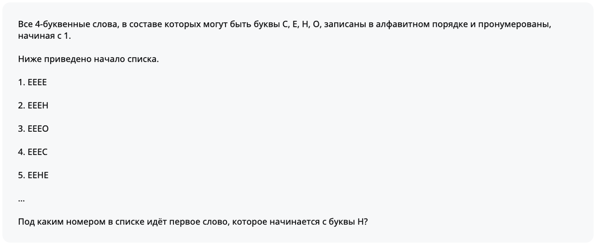 В задачах на нумерацию слов главное не начинать выписывать варианты вручную. Здесь все решается буквально за минуту, если понять принцип. Все 4-буквенные слова составлены из букв: С, Е, Н, О и записаны в алфавитном порядке, начиная с 1. Начало списка такое: Нужно определить: под каким номером стоит первое слово, которое начинается с буквы Н? По приведенному началу списка видно, что буквы идут в таком порядке: Е, Н, О, С Почему именно так?