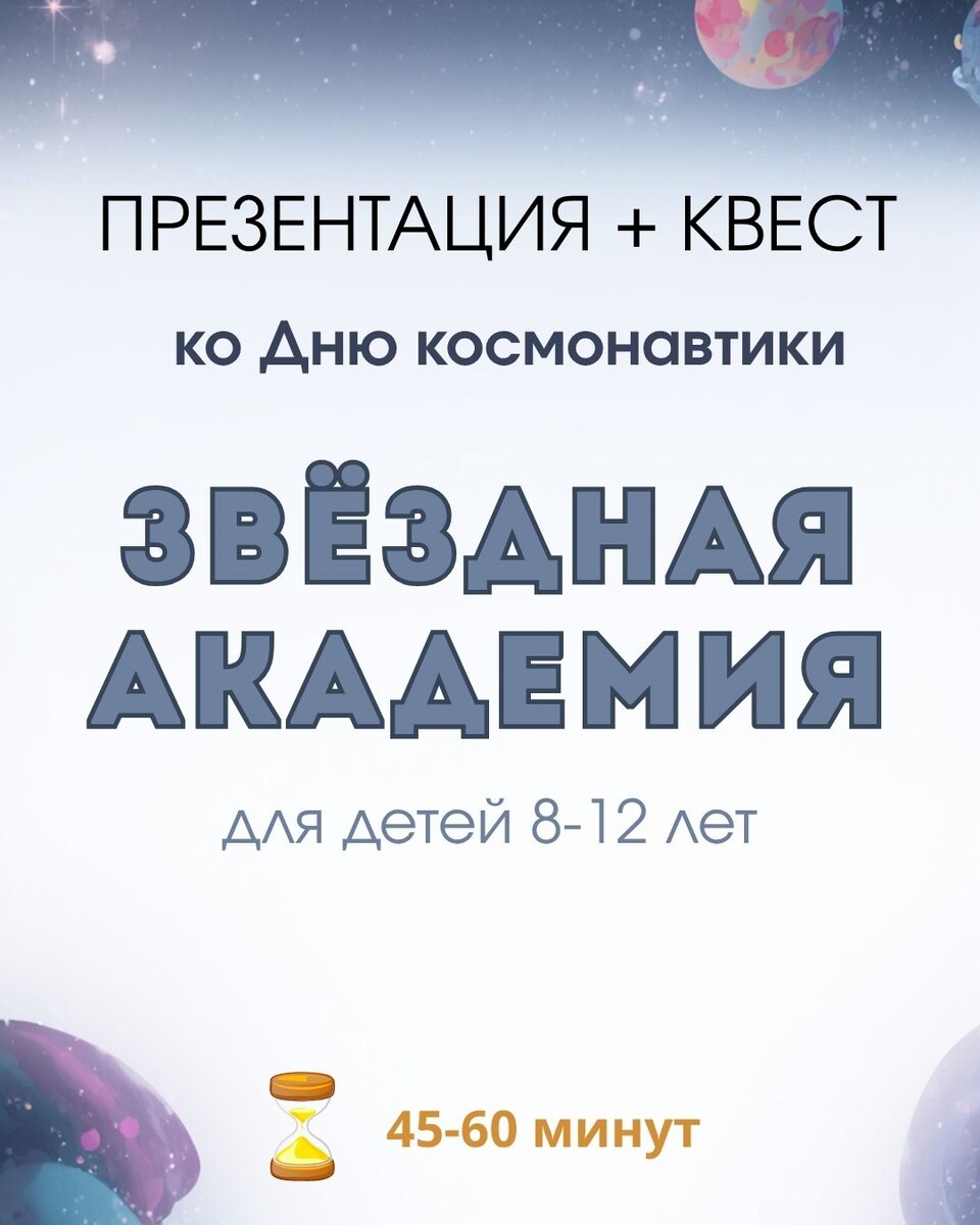 🚀 Готовый космический квест для класса — скачал и проводи! ✨ «ЗВЁЗДНАЯ АКАДЕМИЯ» — это презентация с квестом для детей 8-12 лет, который превращает обычный урок в космическое приключение. 🃏 5 курсов с заданиями на карточках: 0. Стартовое послание от Центра управления полётами - аудио. 1️⃣ Байконур, первый полёт: задание на карточке 2️⃣ Путешествие по планетам Солнечной системы: картинки планет - собираем по удалённости от Солнца и читаем зашифрованное послание. 3️⃣ Как летит ракета: слушаем аудио запуска космического корабля. 4️⃣ Жизнь на орбите, МКС: картинка-пазл. 5️⃣ Приземление: аудио-задание по всему материалу - пометить верные факты. 🏆 Дипломы и звёзды Команда, давшая первой правильный ответ, награждается звездой. В финале все экипажи получают Диплом, а команду, набравшую больше всех звёзд, ждёт сюрприз (сюрприз с вас - премирование или символический приз). ⏱ ТАЙМИНГ: Вся миссия занимает 45-60 минут — идеально для одного урока или мероприятия. 💲 Стоимость: 300 рублей (
