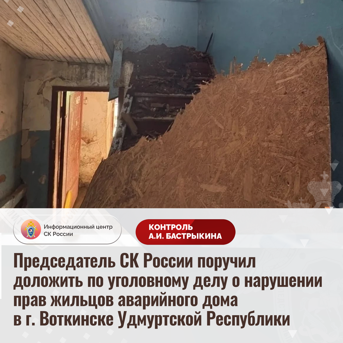 Председатель СК России поручил доложить по уголовному делу о нарушении прав жильцов аварийного дома в г. Воткинске Удмуртской Республики В сети Интернет сообщается, что в апреле текущего года в одном из подъездов многоквартирного дома 1960 года постройки на улице Азина в городе Воткинске Удмуртской Республики обрушилось потолочное перекрытие. Пострадавших удалось избежать. Отмечается, что в 2019 году строение ввиду высокой степени физического износа конструкций признано аварийным, однако до настоящего времени часть жильцов не расселена. В СУ СК России по Удмуртской Республике возбуждено уголовное дело. Председатель Следственного комитета Российской Федерации Александр Иванович Бастрыкин поручил руководителю СУ СК России по Удмуртской Республике Рустаму Рашидовичу Тугушеву доложить о ходе и результатах расследования уголовного дела. Исполнение поручения поставлено на контроль в центральном аппарате ведомства. #СледственныйКомитет #СКРоссии #СК #ИЦСКР #ИнформационныйЦентр #АлександрБаст