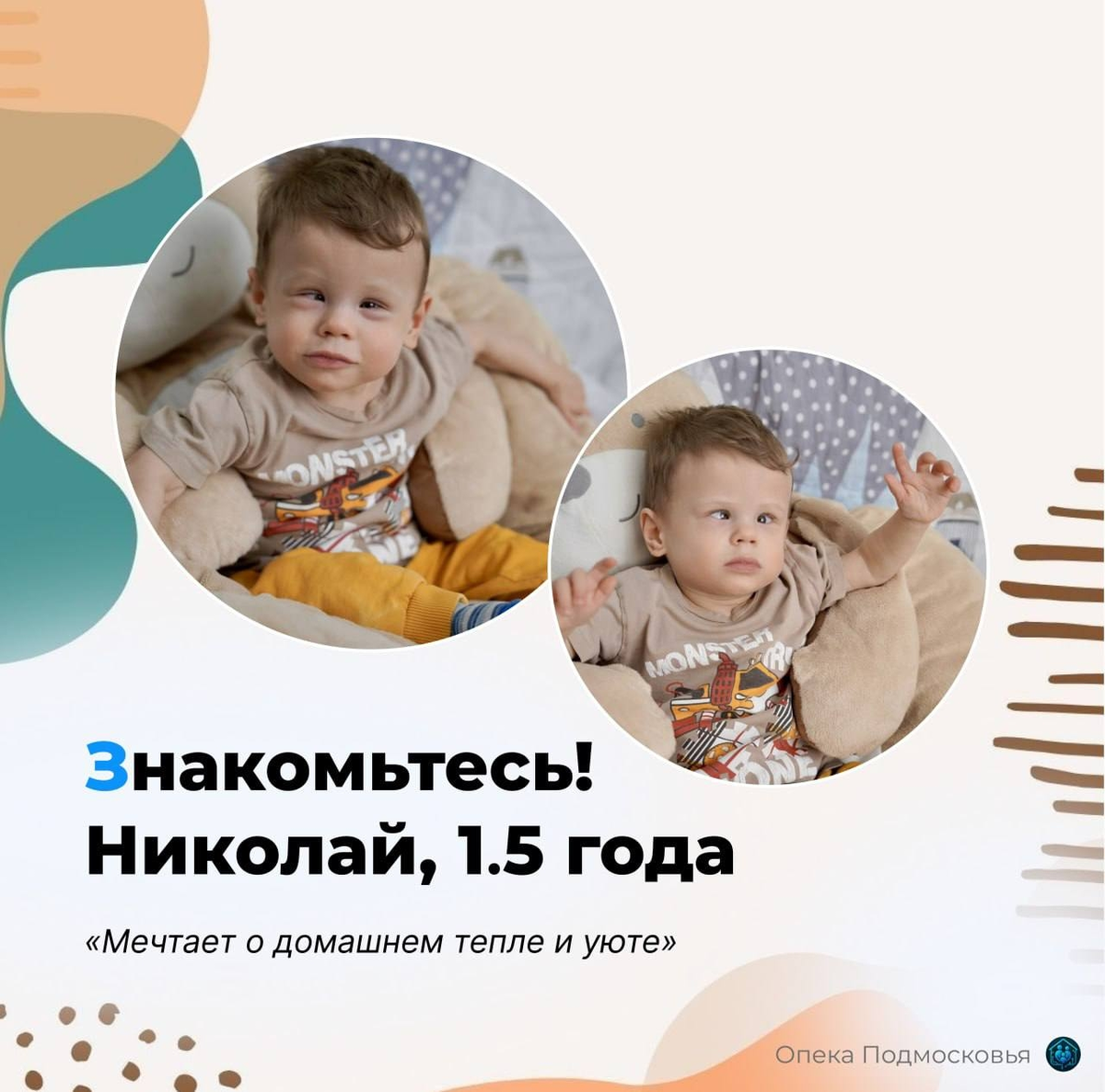 Коля — совсем крошечный мальчик, которому сейчас больше всего на свете нужно тепло родных рук. Он внимательно смотрит на взрослых, тянется к ним, будто уже чувствует: где-то есть его мама и папа. Он только начинает узнавать этот мир — и очень важно, чтобы рядом оказался человек, который: обнимет, поддержит, порадуется первым шагам. Коля – обаятельный, тихий, спокойный и улыбчивый мальчик. Он внимательно всё рассматривает: как падает лучик света на пол, как шуршит занавеска, как взрослый моет руки у раковины. Для него каждый звук, каждое движение — маленькое открытие. Всё вокруг живое, новое, удивительное, и он смотрит на это со сосредоточенным любопытством. Коленька тянется к людям — не громко, не требовательно, но искренне. Если вы подойдёте, наклонитесь, протянете руку — он посмотрит вам в глаза, а иногда даже потянется своей ладошкой. Коля пока не говорит словами, но лепечет, особенно когда доволен. Иногда кажется, что он уже пробует «поговорить»: «А-да… ма… ба…» — и в этих слогах —