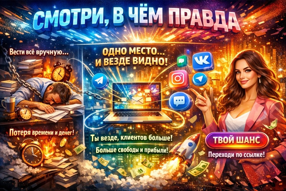 Потому что люди везде. Кто-то увидит тебя в Telegram, кто-то во ВКонтакте, кто-то вообще в другом месте. И пока тебя нет в этих точках, ты просто теряешь клиентов, заказы и деньги. Но вручную всё это вести — это сдохнуть можно. На это уходит слишком много времени. Вместо работы, клиентов и творчества. ⬇️ И вот тут есть очень классное решение: можно вести одну основную площадку, а в остальных тоже присутствовать без этой вечной беготни и дублирования. То есть тебя видят в разных соцсетях, ⬇️ к тебе может прийти больше людей, ⬇️ а ты не тратишь на это полжизни. Хочешь забрать всех клиентов и при этом тратить мало времени Переходи по ссылке и забирай. ЗАБРАТЬ ИНСТРУМЕНТ ЗАБРАТЬ ИНСТРУМЕНТ ЗАБРАТЬ ИНСТРУМЕНТ Лучше тратить деньги, которые приходят от клиентов, на себя и свою жизнь, чем тратить время на постоянный поиск клиентов.