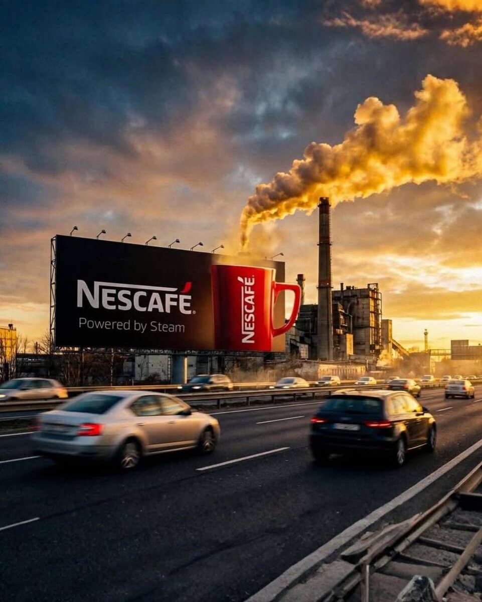☕️ Нескафе использовали трубу на линии обзора с рекламным щитом так, что дым выглядел словно пар от чашки горячего кофе. Простое решение, которое сразу привлекает внимание и создаёт эффект «вау»🔥 Эта кампания показывает, как окружающая среда может стать частью креатива. 👉Реклама запоминается, вовлекает зрителя и демонстрирует, что эффектный визуальный приём не обязательно требует сложных технологий - иногда достаточно найти правильное сочетание пространства и идеи. Видели ли вы эту новость? #новостимаркетинга_гелевей