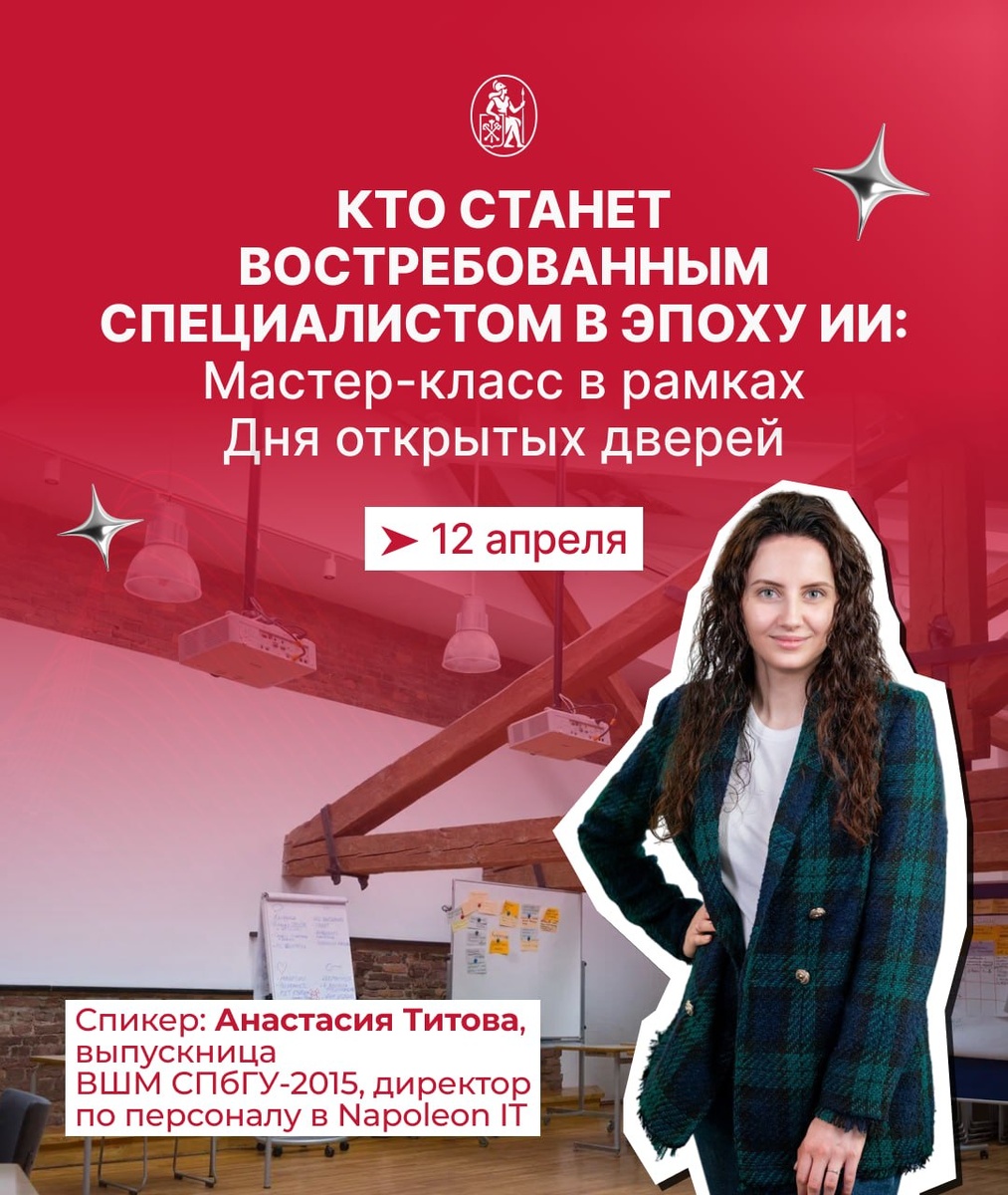 специалистом в эпоху ИИ» от Анастасии Титовой, директора по персоналу Napoleon IT, выпускницы ВШМ СПбГУ. Вы узнаете: ➡ Почему специалисты, работающие с ИИ, – новая элита рынка труда; ➡ Какие навыки действительно дают карьерное преимущество сегодня; ➡ Как меняются требования работодателей IT-компаний; ➡ Что стоит начать делать уже сейчас, если вы хотите оставаться востребованными, когда AI меняет правила игры. Не пропустите возможность получить инсайты от эксперта рынка! 💫 Приходите на День открытых дверей программ магистратуры ВШМ СПбГУ 12 апреля! 🔗 Регистрируйтесь по ссылке — подробности ищите на сайте 👩 Подписывайтесь на нас в ВК и MAX!