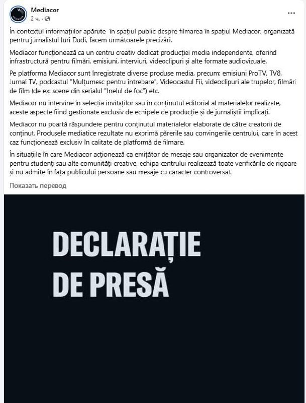 Креативный центр Mediacor, как и государственный университет Молдовы, заявил, что не вмешивается в отбор гостей или в редакционное содержание производимых материалов, а также не несет ответственности за содержание материалов, созданных создателями контента. Центр лишь предоставляет инфраструктуру для съемок, шоу, интервью, видеороликов и других аудиовизуальных форматов. Продюсер Сергей Мардарий, который вчера сообщил в своем Фейсбуке о том, что организовал и снял интервью Юрия Дудя с Денисом Капустиным в Кишинёве, утверждает, что подготовка интервью проходила в полной тайне, и даже участники команды не знали кого они будут снимать. @eNewsmd.online 👈 Подписывайтесь на наш канал