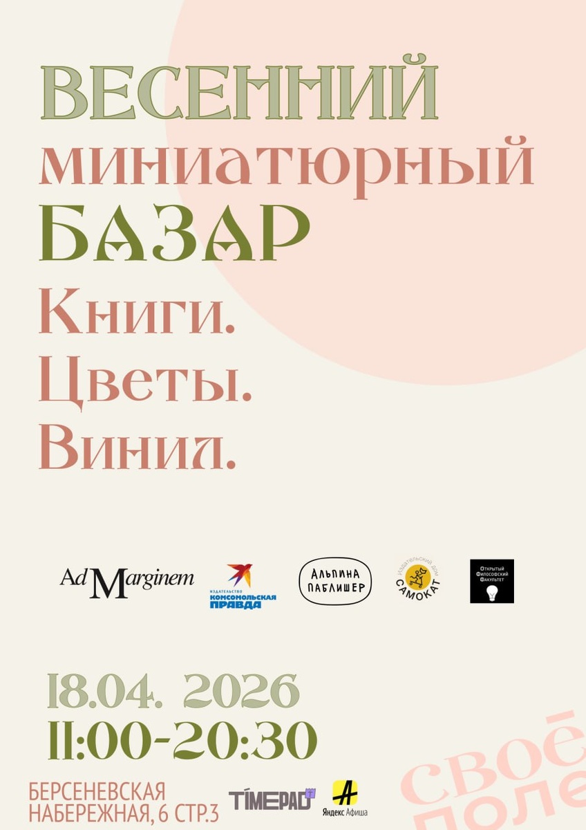 ! Приглашаем вас на Весенний миниатюрный базар с книжным настроением! Мы подружились с замечательным местом с очень символичным названием – "Своё поле". Оно-то миниатюрный базар и организует. Своё Поле — это интеллектуальное пространство, расположенное в башнях конфетного цеха фабрики "Красный октябрь", в котором проходят концерты, лекции и встречи с интересными людьми. А миссия проекта — показать, что искусство может быть опорой и вдохновлять. Нам это созвучно. Весенний миниатюрный базар пройдет 18 апреля с 11 утра до 20:30 вечера по адресу: Москва, Берсеневская наб. 6, стр.3 подъезд А (Красный Октябрь) В рамках миниатюрного базара можно провести время с детьми, пополнить свою домашнюю библиотеку, поучаствовать в мастер-классе и многое другое. Приходите, мы там тоже будем! Программу и подробности события можно изучить по ссылке: https://svoepole.ru/events/1804-vesennij-miniatjurnyj-bazar-v-svoem-pole-1 До скорых встреч в Москве!