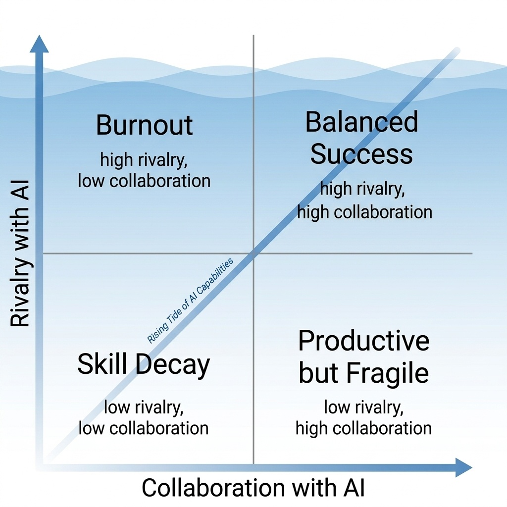 Как ни странно, выход нашёлся в самом обычном для нас методе взаимодействия со всем окружающим миром — в умеренности. Помните пресловутый парафраз с Парацельса — «всё есть яд и всё есть лекарство: вопрос лишь в дозе»? В новых условиях рабочего процесса эта «заповедь» актуальна как никогда. Именно парадоксальное сочетание обоих подходов выводит из тупика. Одновременно и высокое сотрудничество, отмеченное активным использованием ИИ, и высокое соперничество, выражающееся в самостоятельной работе и конкуренции с ним, показывают наилучшие результаты. Профессионалы, чья стратегия работы обнаруживает такую симбиотическую политику, как показали итоги исследования, демонстрируют как высокую продуктивность вкупе с сохранением навыков, так и удовлетворённость, уверенность и общее душевное благополучие.