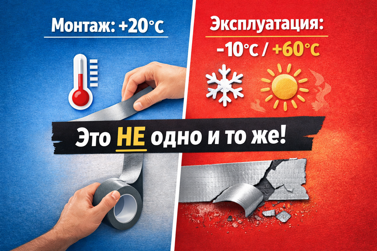 Частая ошибка при работе с клейкими лентами — думать, что если лента приклеилась, значит соединение будет держать в любых условиях. На практике всё зависит от разницы между температурой монтажа и температурой эксплуатации. Это та температура, при которой вы клеите ленту: ❌ Ошибка: «Приклеили при +20°C — значит и при -10°C будет держать».