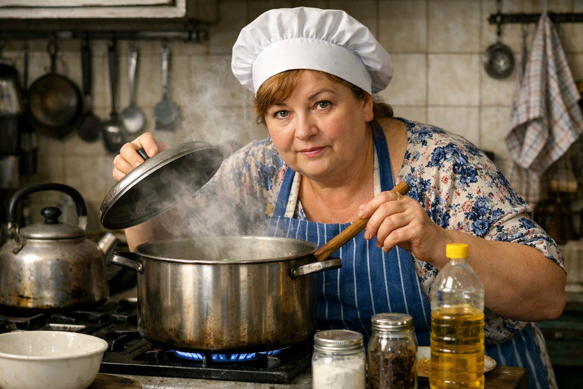 Окно над мойкой запотело, на стекле медленно ползла прозрачная дорожка, а под лампой блестел нож, которым она резала укроп для бульона. Вытяжка тянула глухо и ровно, крышка кастрюли тихо дрожала, по плитке тянулся запах кости, лука и тёплого перца. Ручка у большой кастрюли нагрелась так, что пришлось подхватить её полотенцем. Алевтина поправила передник, взяла ложку, попробовала бульон и поняла: соли пока хватит, а вот терпения на этот день может не хватить.