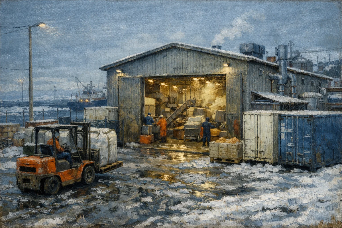 Технологический комплекс включает сушильный барабан, шнековый пресс для отделения жира, дробилку-костерезку, мельницу тонкого помола и автоматическую фасовочную линию. Специфика арктического размещения потребовала включить в состав двухступенчатые очистные сооружения (2,5 млн рублей) и биофильтры воздухоочистки (1 млн рублей) – без них получение санитарного заключения в городской черте невозможно. Холодильный склад на 150 тонн при −18 °C обеспечивает буферное хранение как сырья, так и готовой продукции в межнавигационный период.