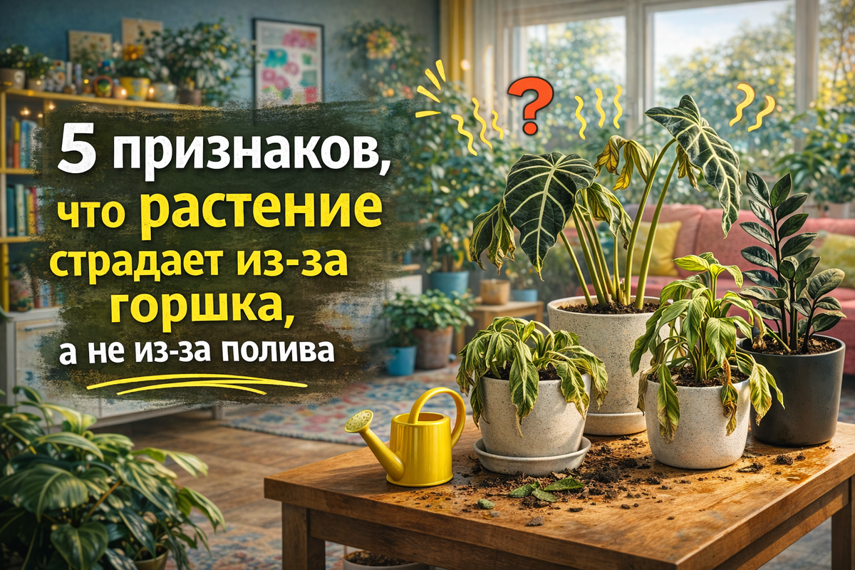 Если коротко, пять главных признаков, что растение страдает именно из-за горшка, а не только из-за полива, выглядят так: грунт сохнет слишком долго или слишком быстро, растение явно непропорционально своему объёму, после полива нет ожидаемой реакции, корни показывают, что места уже нет, и само растение ведёт себя странно и нестабильно при вроде бы нормальном уходе. И вот здесь мы перестаём ругать лейку за всё подряд и начинаем смотреть шире.