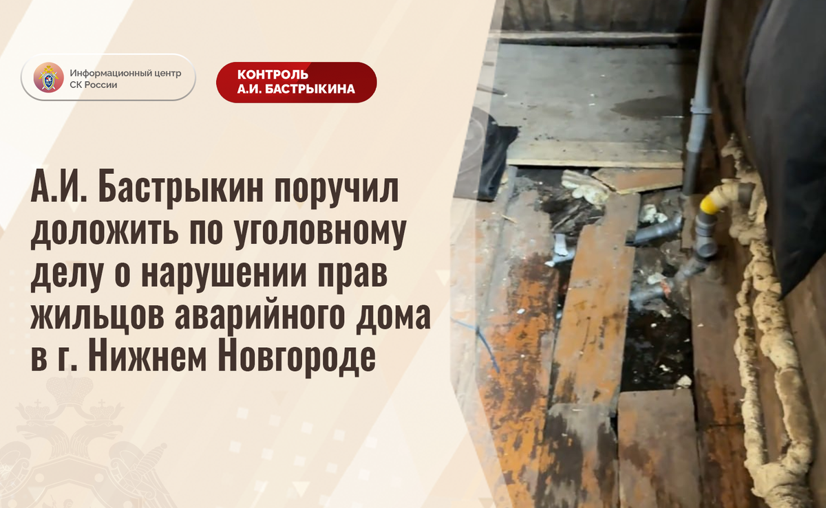 А.И. Бастрыкин поручил доложить по уголовному делу о нарушении прав жильцов аварийного дома в г. Нижнем Новгороде В комментариях в аккаунте приёмной Председателя СК России А.И. Бастрыкина в социальной сети «ВКонтакте» размещено обращение по вопросу нарушения прав жильцов многоквартирного дома на улице Бакунина в городе Нижнем Новгороде. Стены и перекрытия здания 1917 года постройки разрушаются, инженерные системы неисправны, что в марте текущего года привело к прорыву системы водоснабжения. В 2024 году строение ввиду высокой степени физического износа конструкций признано аварийным, однако мер к расселению граждан не принимается. При этом управляющей организацией обслуживание дома не осуществляется. Обращения жильцов в компетентные органы результатов не принесли. Ранее указанная ситуация освещалась в социальной сети. В СУ СК России по Нижегородской области возбуждено уголовное дело. Председатель Следственного комитета Российской Федерации Александр Иванович Бастрыкин поручил руководит