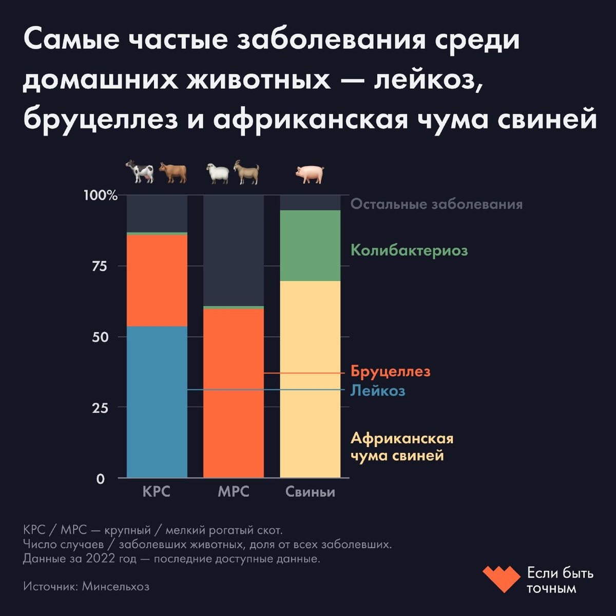 Аналитический проект «Если быть точным» разобрался, какие болезни циркулируют в животноводстве России и насколько они опасны. Среди крупных рогатых животных чаще всего встречается лейкоз — в 2023 году около 12 тысяч случаев в 63 регионах. Вирус вызывает рак крови. Вакцины нет, лечение не применяется — животных умерщвляют. Второе по частоте — бруцеллёз. В 2024 году зарегистрировано свыше 530 случаев заражения среди людей при уходе за животными, забое и разделке. Для свиней наиболее опасна африканская чума: 58 вспышек в 49 регионах в 2023 году, уничтожено сотни тысяч животных. У птицы — птичий грипп: в 2023 году из-за него убили миллионы животных в 16 очагах. На пастереллез, которым объясняют изъятия в Сибири, приходится менее 1% инфекций животных. Эта болезнь лечится антибиотиками, есть вакцина. По ветправилам, больных лечат, здоровых вакцинируют — массовое уничтожение не предусмотрено. Для человека риск заражения минимален, а инфекция обычно вызывает местное воспаление. Ящур — крайне з